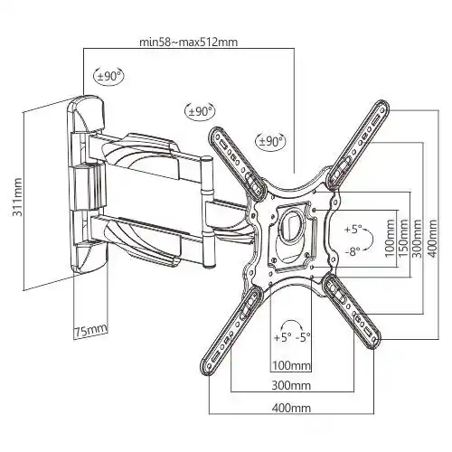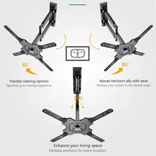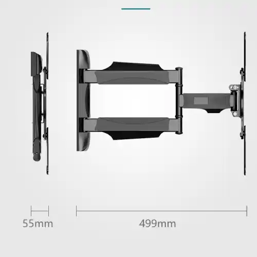 Soporte articulado premium con brazo extensible hasta 50cm para pantallas de 32″ a 60″. Permite movimiento completo: giro de 180° (±90°), inclinación de -8° a +5° y nivelación ajustable para una experiencia visual perfecta.