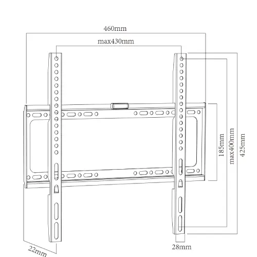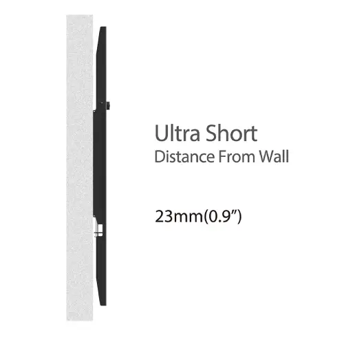 Soporte fijo delgado (solo 2cm de pared) para pantallas de 40″ a 65″. Incluye nivel de burbuja y tornillo de seguridad anti-caída.